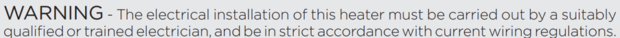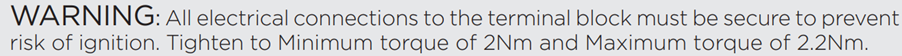 - The wiring to the terminal block inside the heater MUST be connected correctly and tightened to the torque tightness specified in the Manufacturer’s Instructions