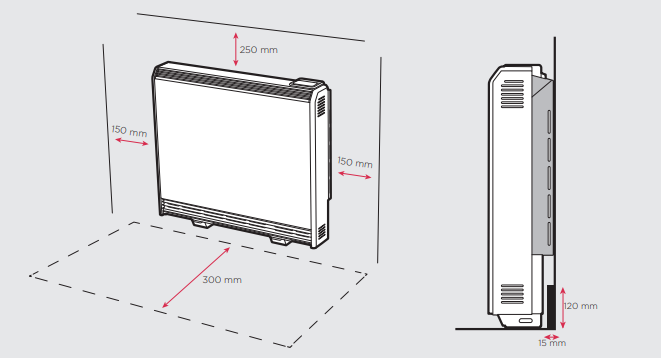 - Consideration must be given to the heaters new location. For example, do the clearances meet the installation requirements? Will the wall and floor materials support the weight of the product? What wall fixings will be required for the type of wall? i.e. brick/plasterboard etc. Is solar gain likely to affect the temperature readings?