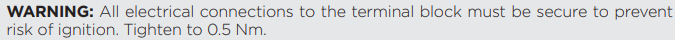 - The wiring to the terminal block inside the heater MUST be connected correctly and tightened to the torque tightness specified in the Manufacturer’s Instructions
